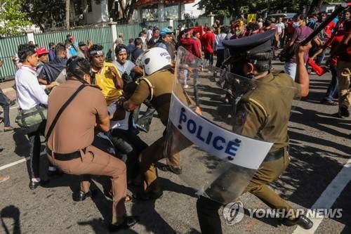 epa10203684 Policemen detain protesters during an anti-government protest march in Colombo, Sri Lanka, 24 September 2022. Protests have been affecting the country for over six months as Sri Lanka faces its worst-ever economic crisis in decades due to a lack of foreign reserves, resulting in severe shortages in food, fuel, medicine, and imported goods. EPA/CHAMILA KARUNARATHNE