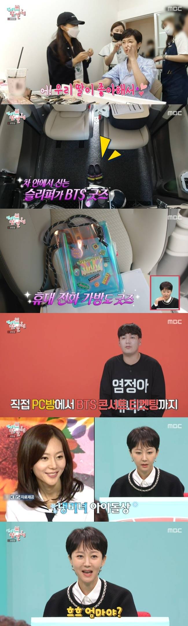 BTS 팬으로 알려진 염정아는 차 곳곳에도 슬리퍼부터 휴대전화 가방까지 BTS 굿즈를 갖고 있었다. 매니저는 “예전에 선배님이 PC방에 같이 가서 BTS 콘서트 티켓팅을 하신 적이 있다”라고 전했다.
