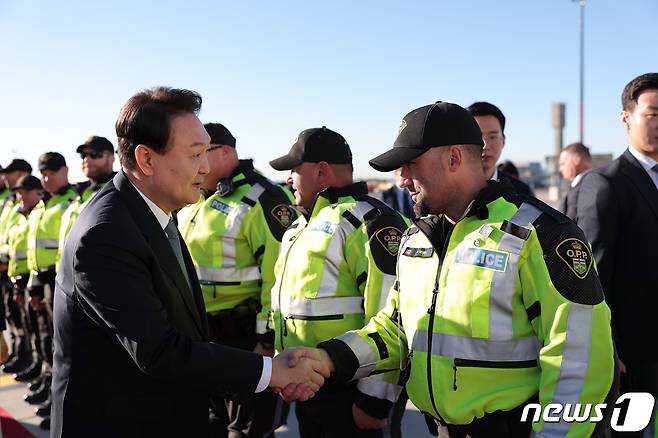 (서울=뉴스1) 안은나 기자 = 윤석열 대통령이 23일 오전(현지시간) 캐나다 토론토 피어슨 국제공항에서 오타와로 이동하기 전 현지 경찰과 인사를 나누고 있다. (대통령실 제공) 2022.9.25/뉴스1