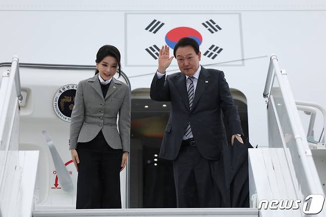 (서울=뉴스1) 안은나 기자 = 윤석열 대통령과 김건희 여사가 22일 오후(현지시간) 미국 뉴욕 JFK 국제공항에서 캐나다로 향하는 공군 1호기에 탑승하며 인사하고 있다. (대통령실 제공) 2022.9.25/뉴스1