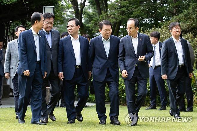 (서울=연합뉴스) 한덕수 국무총리와 국민의힘 정진석 비상대책위원장, 주호영 원내대표가 25일 서울 종로구 총리공관에서 열리는 제4차 고위당정협의회에 앞서 기념촬영을 위해 이동하고 있다. 왼쪽부터 한 총리, 국민의힘 정진석 비상대책위원장, 주호영 원내대표, 성일종 정책위의장, 추경호 부총리 겸 기획재정부 장관. 오른쪽은 김대기 대통령비서실장. 2022.9.25 [국회사진기자단]