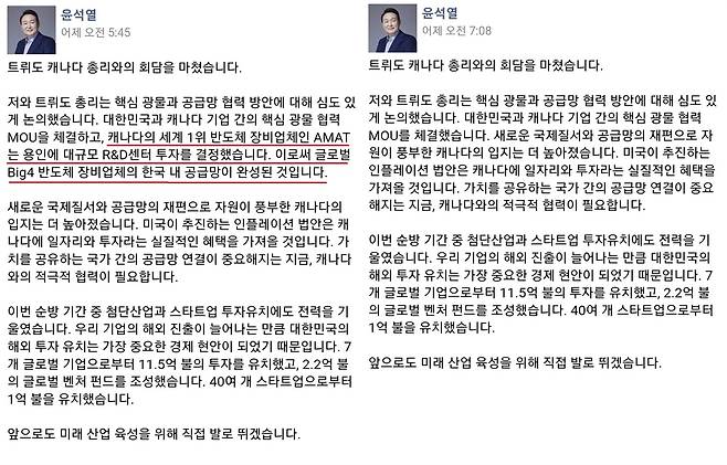 그런데 오전 7시 8분, 원글에서 "캐나다의 세계 1위 반도체 장비업체인 AMAT는 용인에 대규모 R&D센터 투자를 결정했다. 이로써 글로벌 Big4 반도체 장비업체의 한국 내 공급망이 완성된 것"이라는 대목이 아예 빠졌다. 대통령실은 7시 24분 출입기자들에게 "오늘 한국시간 새벽 5시 45분에 게재된 '트뤼도 캐나다 총리 회담 관련 윤석열 대통령 페이스북 메시지의 내용 중 일부를 수정하여 조금 전 7시에 다시 게재했다"고만 알렸다.
