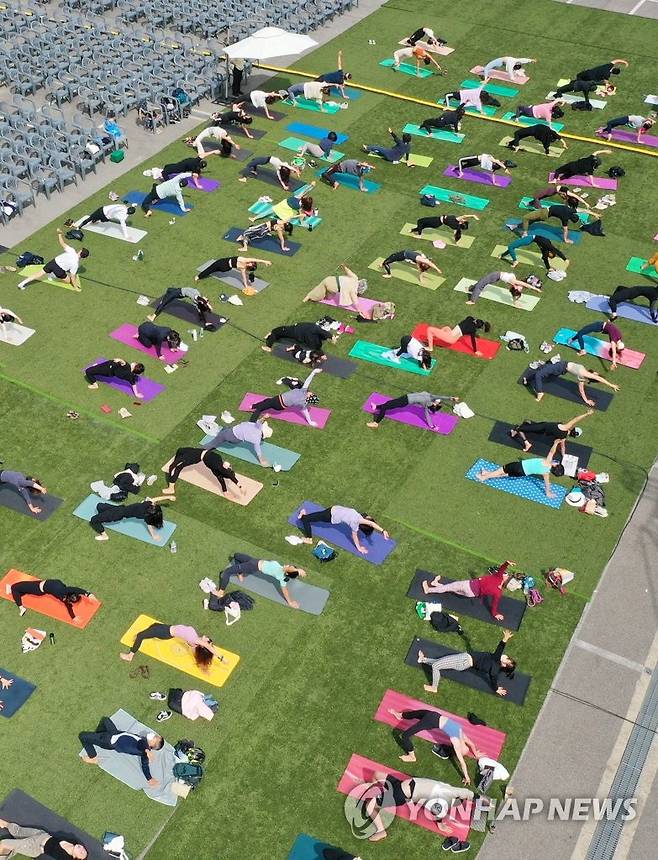 (춘천=연합뉴스) 양지웅 기자 = 25일 강원 춘천시 송암스포츠타운에서 열린 '2022 춘천국제레저대회'에서 시민들이 힐링 요가를 체험하고 있다. 2022.9.25