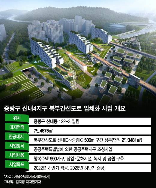 사업을 추진하는 신내4지구 부지 면적은 총 7만4675㎡다. 이 중 2만3481㎡은 북부간선도로 신내IC~중랑IC 구간 상부를 덮은 인공대지이며, 나머지는 신내차량기지 사이 저층창고 부지(3만3519㎡)와 도로 북측의 완충녹지 일부(1만7675㎡)로 구성됐다.