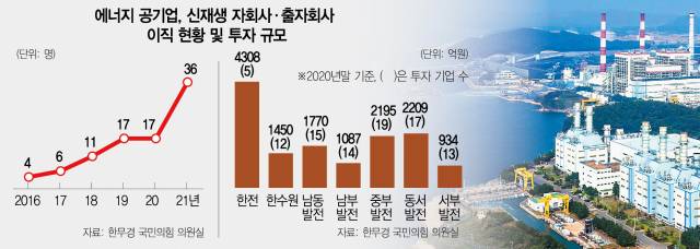 25일 국회 산업통상자원중소벤처기업위원회 소속 한무경 국민의힘 의원이 한전 등으로부터 입수한 자료를 분석한 결과 한전, 한국수력원자력, 남부·서부·중부·남동·동서발전 등 7개사가 2020년까지 1조 3953억 원을 투자해 만든 신재생에너지 관련 자회사·출자회사 95곳(중복 포함)에 2016년부터 지난해까지 7개사 직원 91명이 이직했다.