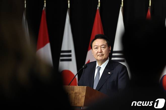 (서울=뉴스1) 안은나 기자 = 윤석열 대통령이 23일 오후(현지시간) 캐나다 오타와 맥도날드경 빌딩에서 저스틴 트뤼도 총리와 공동기자회견을 하고 있다. (대통령실 제공) 2022.9.25/뉴스1