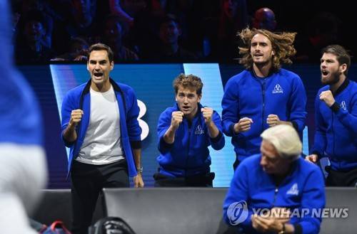 epa10205602 Team Europe members celebrate after winning a crucial point during a doubles match between Team World's Jack Sock and Felix Auger-Aliassime and Team Europe's Andy Murray and Matteo Berrettini at the Laver Cup tennis tournament at the O2 Arena in London, Britain, 25 September 2022. EPA/ANDY RAIN