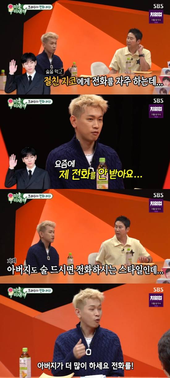 크러쉬는 "지코라는 친구한테 친해서 자주 전화를 하는데 그 친구는 요즘에는 제 전화를 안 받는다. 그게 저희 아버지도 그런 게 있으신데 보고 배운 것 같다"라며 고백했다.
