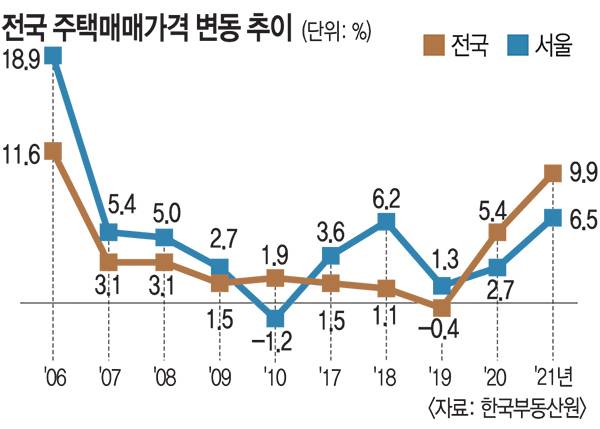 문재인정부 때도 전국이 0.4% 하락한 2019년을 빼곤 매년 집값이 상승했다.
