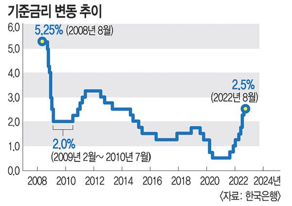 그러나 최근 시장을 더욱 안 좋게 보는 근거는 금리 차이 때문이다. 2009년에는 글로벌 금융위기에 따른 경기 침체를 막기 위해 기준금리를 내리던 시기였다. 당시 한국은행은 2008년 8월부터 7차례에 걸쳐 기준금리를 5.25%에서 6개월 만에 2.0%로 대폭 인하했다. 반면 최근 상황은 지난해 8월부터 7차례에 걸쳐 0.5%였던 기준금리를 2.5%까지 올렸고, 다음 달에도 ‘빅스텝’(기준금리를 한 번에 0.5% 포인트 올리는 일)이 예상된다.
