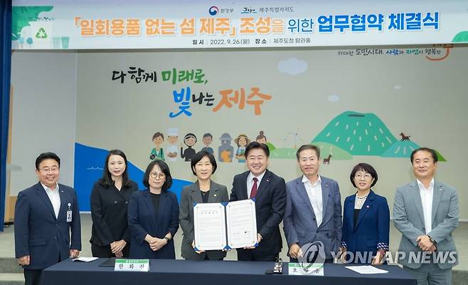 (제주=연합뉴스) 오영훈 제주지사(오른쪽에서 네 번째)와 한화진 환경부 장관(오른쪽 다섯 번째)이 26일 제주도청에서 '일회용품 없는 섬 제주' 조성을 위한 업무협약서를 맺고 기념촬영을 하고 있다. 2022.9.26 [제주도 제공. 재판매 및 DB 금지]