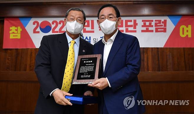 (서울=연합뉴스) 백승렬 기자 = 국민의힘 주호영 원내대표가 26일 오후 서울 국회 도서관에서 열린 '2022 국민특보단 포럼' 창립식 및 초청특강에서 홍성태 상임대표에게 감사패를 전달받고 있다. 2022.9.26 [국회사진기자단]