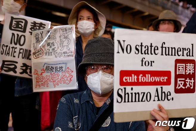 (도쿄 로이터=뉴스1) 김성식 기자 = 25일 일본 도쿄에서 아베 신조 전 총리의 국장을 반대하는 시민들이 거리로 나왔다. 시위에 참가한 한 시민은 '사이비 종교 추종자(cult follower) 아베 신조의 국장을 반대한다'는 영문 팻말을 들고 있다. 아베 전 총리의 장례식은 26일 국장으로 치러질 예정이다.