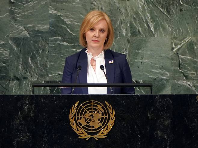 | ▲ 리즈 트러스 영국 총리가 21일(현지시간) 미국 뉴욕 유엔본부에서 열린 제77차 유엔총회에서 연설하고 있다. |
