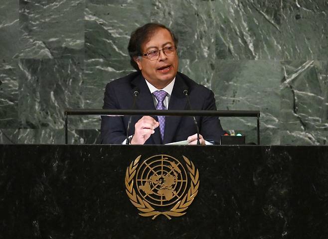 | ▲ 구스타보 페트로 콜롬비아 대통령이 20일(현지시간) 미국 뉴욕 유엔본부에서 열린 제77차 유엔총회에서 연설하고 있다. 그는 "마약과의 전쟁과 기후 위기와의 싸움은 실패했다"며 "코카잎을 없애려고 숲에 불을 지르고 독성 제초제를 뿌리면서 기후위기를 개선하자는 말들은 위선적"이라고 주장했다. |
