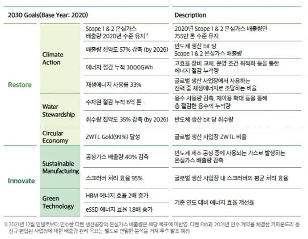 보고서에 따르면 SK하이닉스는 2030년까지 스코프 1&2 기준 온실가스 배출량을 2020년 수준(755만t)으로 유지하고, 2026년까지 배출량 집약도(반도체 생산 비트당 온실가스 배출량)을 57% 줄이겠다고 공언했다. 2030년까지 장비를 고효율로 교체하고 운영 조건을 최적화하는 방식으로 3000GWh 규모의 에너지를 절감하고 재생에너지 사용률도 33%까지 끌어올리겠다고 밝혔다. SK하이닉스는 2050년까지 재생에너지 사용률 100%를 공언한 RE100 가입 기업이기도 하다.