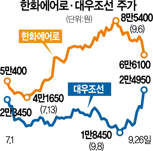 반면 매수 주체인 한화그룹은 계열사 주가 전반이 급락하는 등 곤혹을 치렀다. 이날 한화(-5.29%)와 한화에어로스페이스(-10.80%), 한화시스템(272210)(-7.17%)은 모두 하락 마감했다. 특히 대우조선해양의 매각 금액 2조 원의 절반에 해당하는 1조 원을 부담하게 된 한화에어로스페이스는 기관이 728억 원어치를 내던지며 하방 압력을 키웠다. 한화그룹이 대우조선해양의 인수를 완료할 경우 육해공 통합 방산 시스템을 보유하게 돼 방산 수출 확대에 시너지가 예상된다는 긍정적인 전망도 나왔지만 그보다는 재무 악화에 대한 우려가 더 컸다는 설명이다. 최남곤 유안타증권 연구원은 “대우조선해양과 시너지 효과에 대해서 아직 설득이 안 됐기 때문에 한화의 주가가 하락했다”고 설명했다.