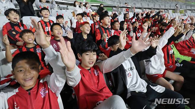 [화성=뉴시스] 김금보 기자 = 실외 마스크 착용 의무 해제 첫날인 26일 오후 경기 화성시 화성종합경기타운에서 열린 올림픽 축구 국가대표팀 평가전 대한민국과 우즈베키스탄 경기를 찾은 어린이 관중들이 마스크를 벗고 응원하고 있다. 2022.09.26. kgb@newsis.com