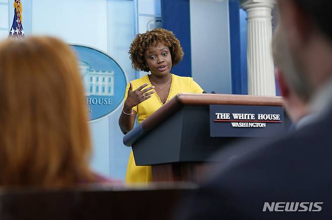 [워싱턴=AP/뉴시스] 카린 장-피에르 백악관 대변인이 26일(현지시간) 백악관에서 일일 브리핑을 하고 있다. 장-피에르 대변인은 "러시아의 합병 주민투표가 국제법을 명백하게 위반한 사기 투표"라며 "러시아가 합병을 추진하면 동맹국 및 파트너들과 함께 경제적 비용을 추가로 부과할 준비가 돼 있다"라고 말했다. 2022.09.27.