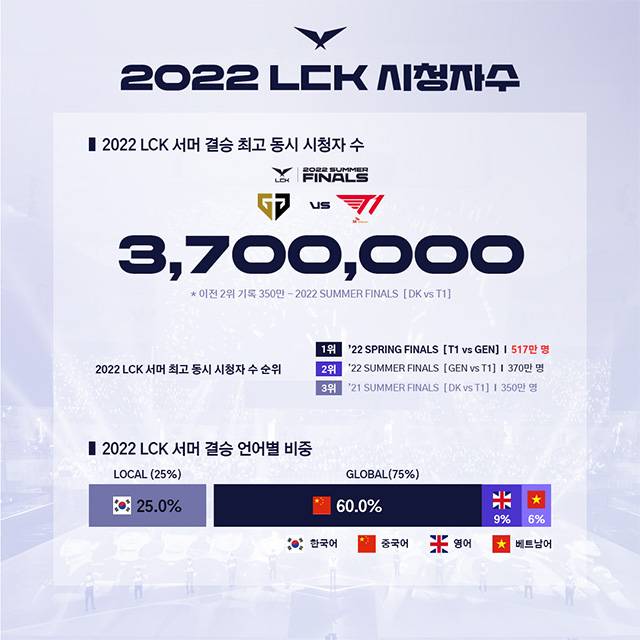 8월 28일(일) 강원도 강릉아레나에서 열린 젠지와 T1의 서머 결승전은 370만 명의 최고 동시시청자수(Peak Concurrent User; PCU)를 달성했다. 이는 2021년 서머 결승전의 350만을 넘어선 수치로, 올해 4월 스프링 결승전에서 나온 LCK 역대 최고 기록인 517만에 이어 역대 2위에 해당하는 기록이다.