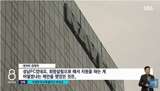 그런데 '희망살림'이 낸 돈은 자체 자금이 아닌, 네이버로부터 후원받은 돈이었던 것으로 확인됐습니다. 네이버로부터 후원받은 돈 일부를 제외한 나머지 대부분을 성남FC에 광고금 명목으로 집행한 겁니다. 이 과정에 대한 저희 <끝까지판다>팀 질의에 네이버 측은 "희망살림을 통해 지원하는 게 어떻겠느냐는 제안을 해 온 것은 성남FC 팀장 이 모 씨"라고 밝혔습니다.