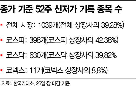 52주 신저가를 기록한 종목들을 시장별로 나눠 살펴보면 코스피 398개, 코스닥 630개, 코넥스 11개 등이었다. 각 시장의 전체 상장사 수와 비교했을 때 코스피시장의 42.38%, 코스닥의 39.82%에 해당하는 종목이 신저가를 기록했다.