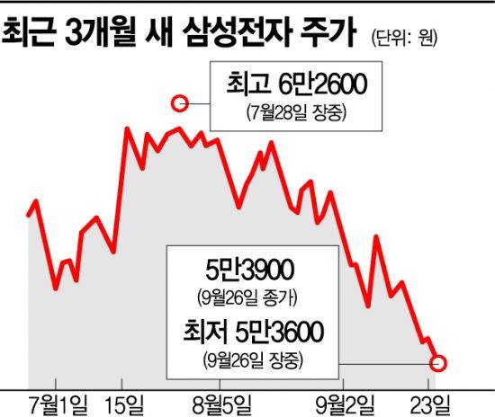 ‘국민주’ 삼성전자도 속절없이 무너지는 국내 증시 여파를 피해가지 못했다. 주가가 5만3000원대까지 떨어지면서 ‘4만전자’도 임박한 것이 아니냐는 우려도 나오고 있다. 이달 들어 삼성전자의 주가는 약 8% 가량 하락했다. 이달 초만 해도 5만8000원대였던 삼성전자는 단 하루(9월1일)를 제외하고 15거래일 연속 외국인들의 순매도세가 이어지고 있다. 이 기간동안 외국인은 1조6327억원치 삼성전자 주식을 순매도한 반면 개인은 2조1243억원치 순매수했다.