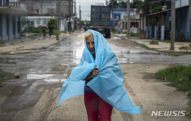 [바타바노=AP/뉴시스] 26일(현지시간) 쿠바 바타바노에서 한 주민이 비닐로 비를 피하고 있다. 열대성 폭풍에서 허리케인으로 세력을 키운 '이언'은 쿠바 서쪽으로 접근하고 있으며 28일경에는 미 플로리다주에 상륙할 것으로 보인다. 2022.09.27.