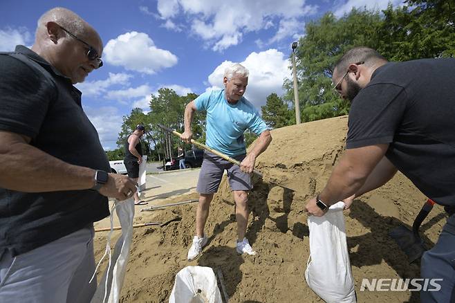 [올랜도=AP/뉴시스] 26일(현지시간) 미 플로리다주 올랜도의 오렌지카운티 공원에서 주민들이 허리케인 이언의 상륙에 대비해 모래주머니를 만들고 있다. 2022.09.27.