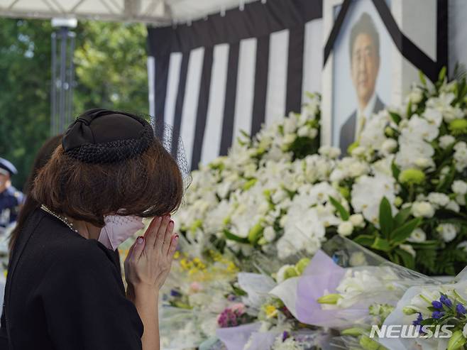 [도쿄=AP/뉴시스] 27일 일본 도쿄의 니혼부도칸 인근 구단자카 공원에서 시민들이 아베 신조 전 일본 총리의 국장에 앞서 조문하고 있다. 아베 전 총리의 국장은 이날 오후 2시에 열린다. 2022.09.27.