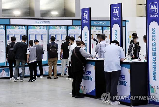 (인천=연합뉴스) 윤태현 기자 = 27일 오전 인천시 연수구 송도컨벤시아에서 열린 '2022 인천 일자리 한마당'에서 구직자들이 채용공고 게시판을 살펴보고 있다. 2022.9.27