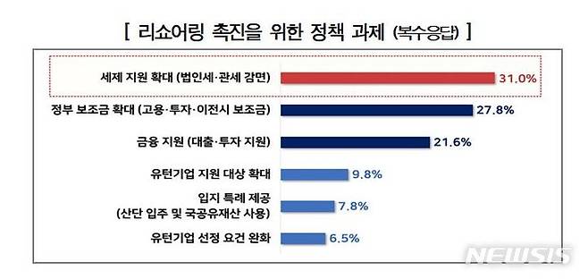 응답 기업들은 리쇼어링 촉진을 위한 정책 과제로 "세제 지원(법인세·관세 감면) 확대"(31.0%)를 가장 많이 꼽았다.