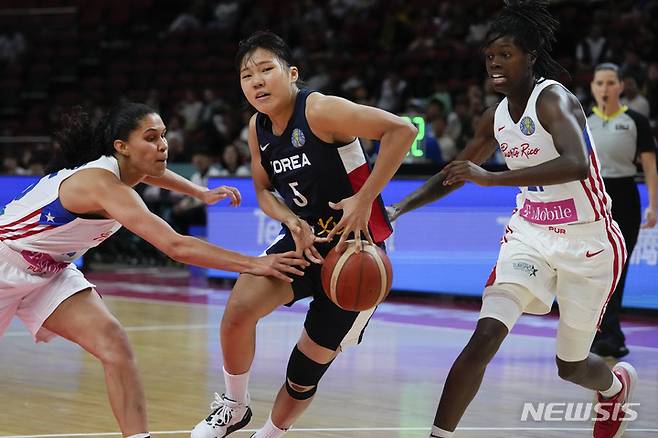 [시드니=AP/뉴시스] 한국 여자농구 대표팀의 박혜진(가운데)이 27일 호주 시드니의 슈퍼돔에서 열린 국제농구연맹(FIBA) 여자농구 월드컵 조별 리그 A조 5차전 푸에르토리코를 상대로 경기하고 있다. 한국은 푸에르토리코에 73-92로 패해 1승 4패를 기록, 조 5위로 각 조 4개 팀이 오르는 8강 진출에 실패했다. 2022.09.27.