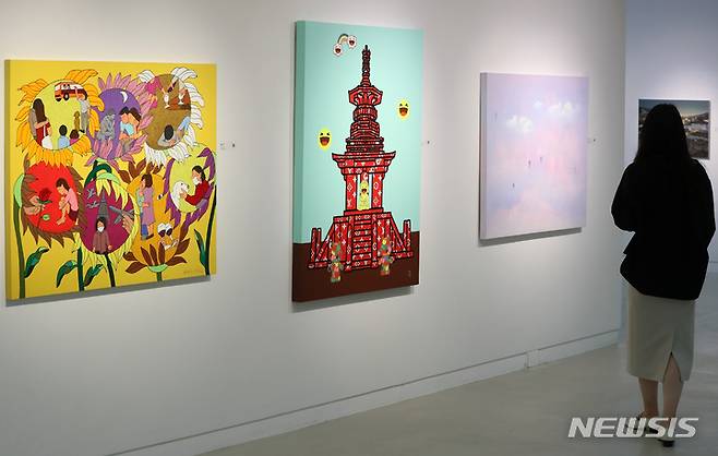 [서울=뉴시스] 이영환 기자 = 27일 오전 서울 종로구 선화랑에서 열린 개관 45주년 기념전을 찾은 한 시민이 전시를 관람하고 있다.2022.09.27. 20hwan@newsis.com