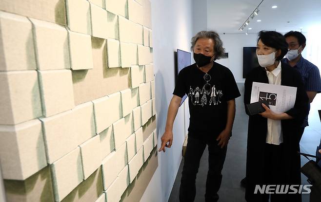[서울=뉴시스] 이영환 기자 = 27일 오전 서울 종로구 선화랑에서 열린 개관 45주년 기념전 전시설명회에서 전시를 기획한 윤진섭(왼쪽) 미술평론가와 원혜경 선화랑 대표가 전시에 대해 설명을 하고 있다. 2022.09.27. 20hwan@newsis.com
