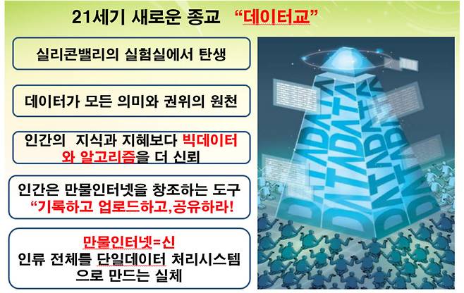 여기서 생겨난 것이 데이터교(dataism)라는 신흥종교다. 중심적 교의는 “인본주의 대신에 데이터를 모든 의미와 권위의 원천으로 삼는다. 현상이나 사물의 가치는 그것이 데이터 처리에 얼마만큼 기여하는 가에 의하여 결정된다”고 하는 것이다. 이젠 가치는 경험 그 자체에 있는 것이 아니라 그것을 자유롭게 유통하는 데이터에 있다. 즉 데이터를 기록하고 업그레이드하고 유통하는가에 달려있다.