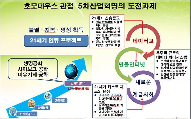 호모데우스-알고리즘-무용자 계급으로 계층화되는 시나리오의 성립 가능성을 배재하기 보다는 가능성에 대한 과제와 대응 방안을 선제적으로 확립해가는 것이 중요하다. 인간성 중심의 비전과 가치를 확립하고 로봇세 도입과 기본소득(basic income)제도의 바람직한 방향 등을 논의하면서 제5차 산업혁명에 현명하게 대응해 가야 할 것이다.