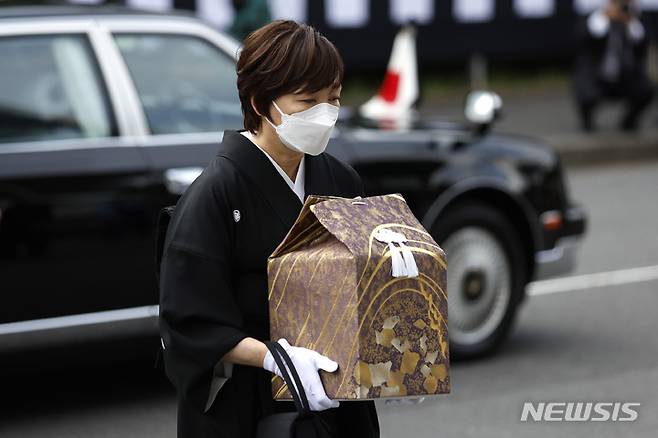 [도쿄=AP/뉴시스] 아베 신조 전 일본 총리의 부인인 아베 아키에 여사가 27일 고인의 유골을 들고 국장이 열리는 도쿄의 닛폰부도칸에 도착하고 있다. 아베 전 총리의 국장이 고인 사망 81일 만에 거행됐다. 2022.09.27.
