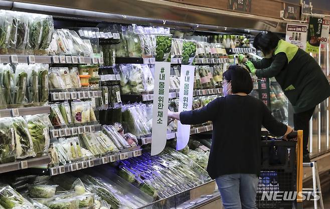 [서울=뉴시스] 김근수 기자 = 27일 오후 서울 시내의 한 대형마트에서 소비자가 물건을 고르고 있다. 전국경제인연합회가 실시한 여론조사에 따르면 올해 고물가, 고금리, 고환율로 인해 국민 10명 중 6명이 상반기 대비 하반기 소비지출을 줄일 것이라고 발표했다. 2022.09.27. ks@newsis.com