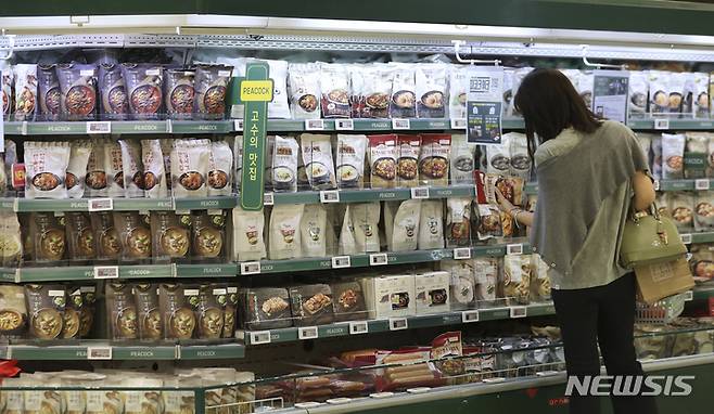 [서울=뉴시스] 김근수 기자 = 27일 오후 서울 시내의 한 대형마트에서 한 소비자가 물건을 고르고 있다. 전국경제인연합회가 실시한 여론조사에 따르면 올해 고물가, 고금리, 고환율로 인해 국민 10명 중 6명이 상반기 대비 하반기 소비지출을 줄일 것이라고 발표했다. 2022.09.27. ks@newsis.com
