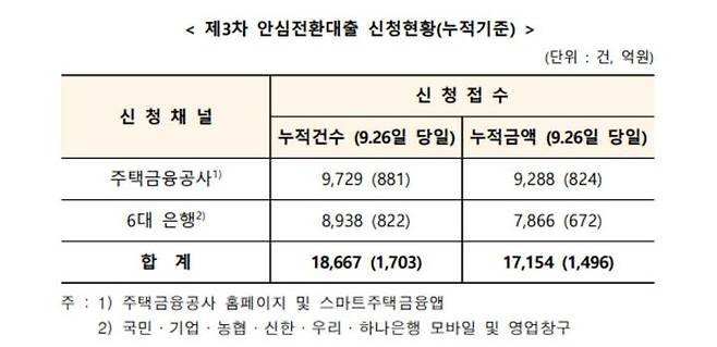 주금공 홈페이지와 스마트주택금융앱을 통해 9729건(9288억원)이 신청됐고, 6대 은행 창구와 모바일 앱을 통해 8938건(7866억원)이 접수됐다.