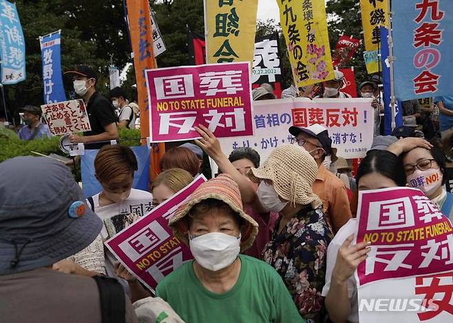 [도쿄=AP/뉴시스] 27일 일본 도쿄에서 아베 신조 전 총리의 국장에 반대하는 시위대가 '국장 반대'라고 쓰인 손팻말을 들고 있다. 2022.09.27.