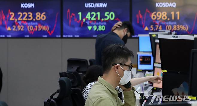 [서울=뉴시스] 이영환 기자 = 코스피가 전 거래일보다 2.92포인트(0.13%) 오른 2223.86에 장을 마감한 27일 오후 서울 중구 하나은행 딜링룸 전광판에 지수가 표시되어 있다. 이날 코스닥지수는 5.74포인트(0.83%) 오른 698.11, 원 ·달러 환율은 9.80원 내린 1421.50원에 마감했다. 2022.09.27. 20hwan@newsis.com