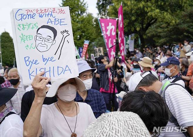 [도쿄=AP/뉴시스] 27일 일본 도쿄에서 아베 신조 전 총리의 국장에 반대하는 시위가 열려 한 참가자가 기시다 후미오 총리를 비난하는 손팻말을 들고 있다. 2022.09.27.