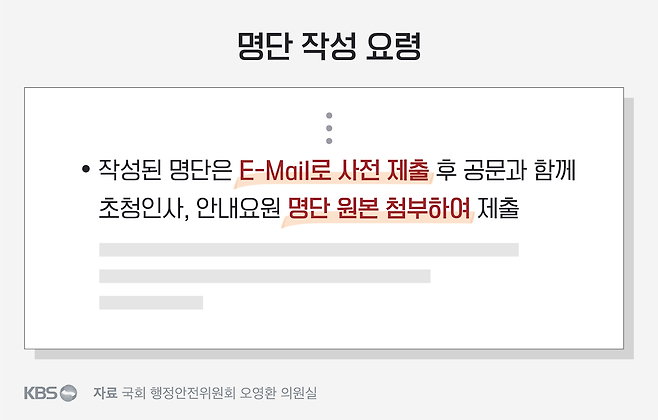 그러나 초청 인사 명단을 유형별로 따로따로 취합했다는 해명 역시 석연치 않습니다. 실제로 해당 공문에는 각 초청 인사 명단을 유형별로 다르게 제출하라는 안내는 어디에도 없습니다.