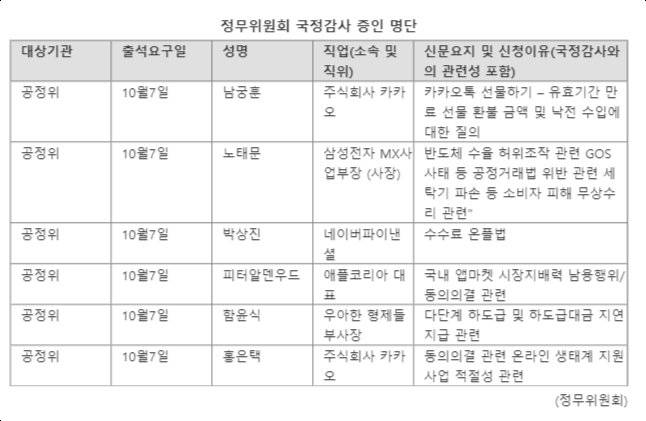 또 박상진 네이버파이낸셜 대표, 함윤식 우아한형제들 부사장, 피터알덴우드 애플코리아 대표 등이 국감 증인으로 출석한다.