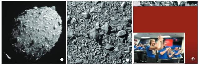 ②DART 우주선은 탑재한 카메라에 디모르포스 표면의 자갈밭이 보일 정도로 접근한 후 ③오전 8시 14분 소행성과 충돌해 나사 관제실과의 교신이 끊어졌다.