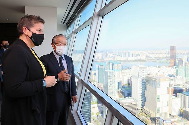 [서울=뉴시스] 조수정 기자 = 권태신 전국경제인연합회(전경련) 부회장이 27일 전경련을 방문한 미시휴즈 미국 위스콘신 주 상무장관에게 한국경제 발전 과정에 대해 설명하고 있다. (사진=전국경제인연합회 제공) 2022.09.27. photo@newsis.com