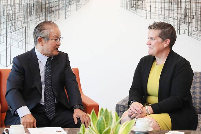 [서울=뉴시스] 조수정 기자 = 권태신 전경련 부회장이 27일 전경련을 방문한 미시휴즈 미국 위스콘신 주 상무장관과 주요현안에 대해 논의하고 있다. (사진=전국경제인연합회 제공) 2022.09.27. photo@newsis.com