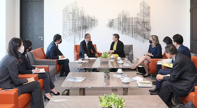 [서울=뉴시스] 조수정 기자 = 권태신 전경련 부회장이 27일 전경련을 방문한 미시휴즈 미국 위스콘신 주 상무장관과 주요현안에 대해 논의하고 있다. (사진=전국경제인연합회 제공) 2022.09.27. photo@newsis.com